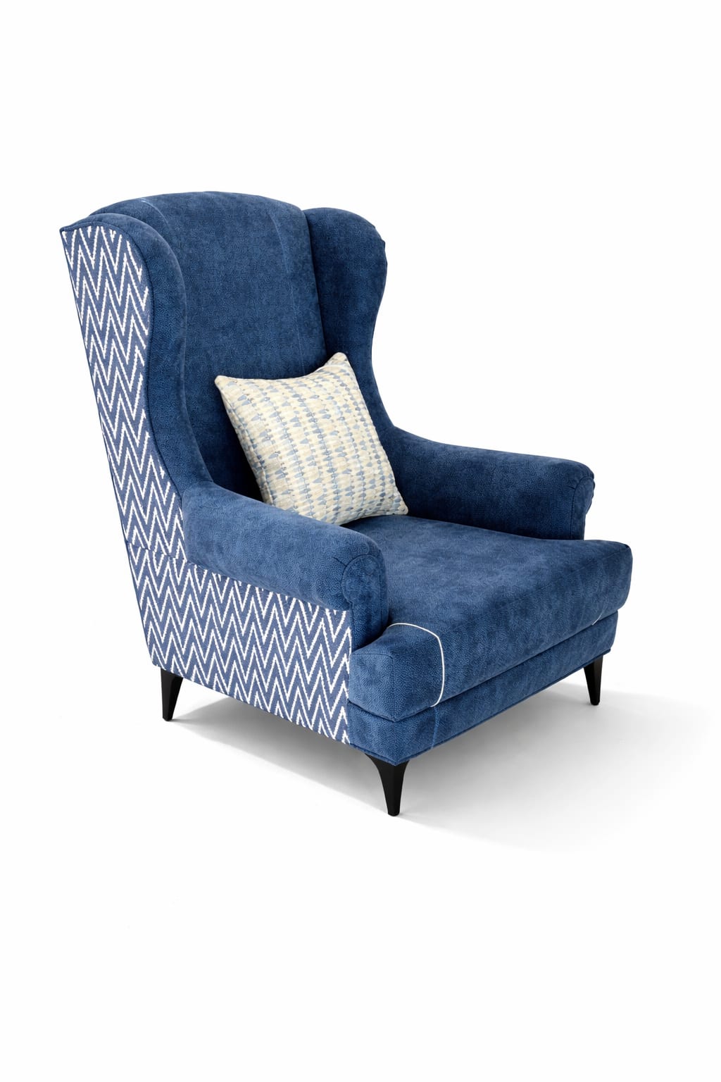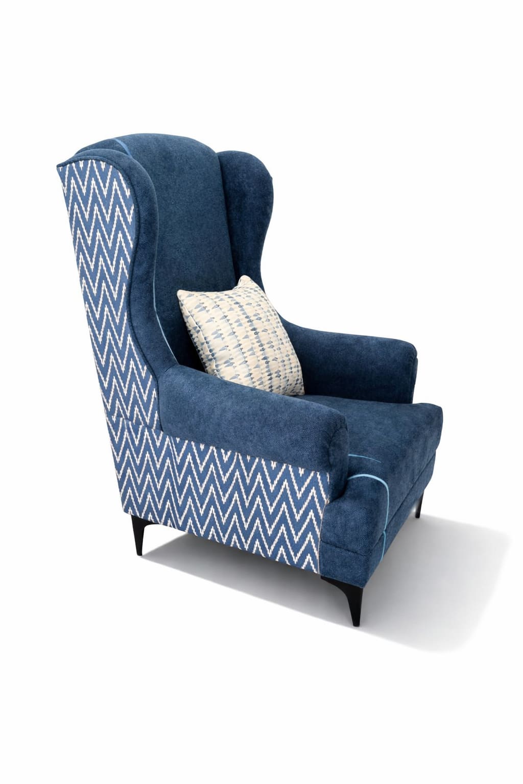 | Dual Fabric Styling | Solid blue with designer chevron pattern sides |